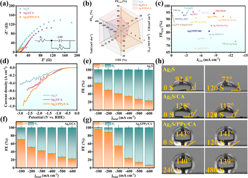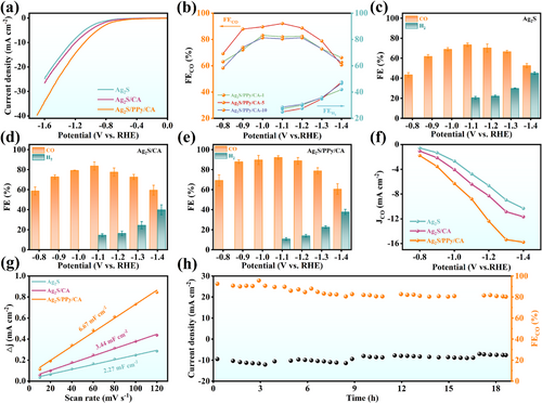 (f) 三元催化剂J_CO达到-23.5 mA/cm²,比纯Ag₂S提高3.2倍。