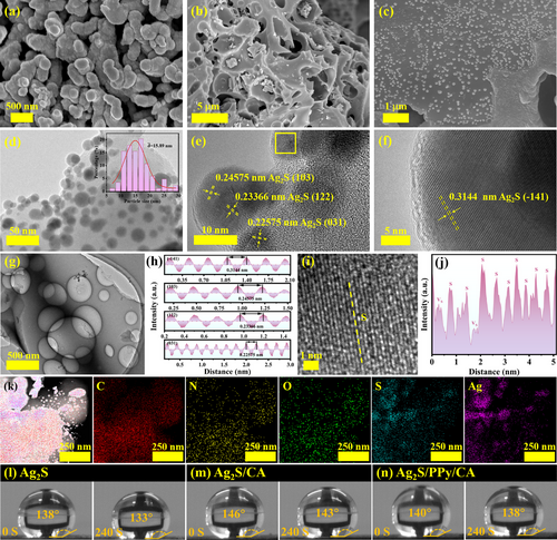 (l-n) 接触角测试表明Ag₂S/PPy/CA具有140°接触角,疏水性稳定性显著提升。