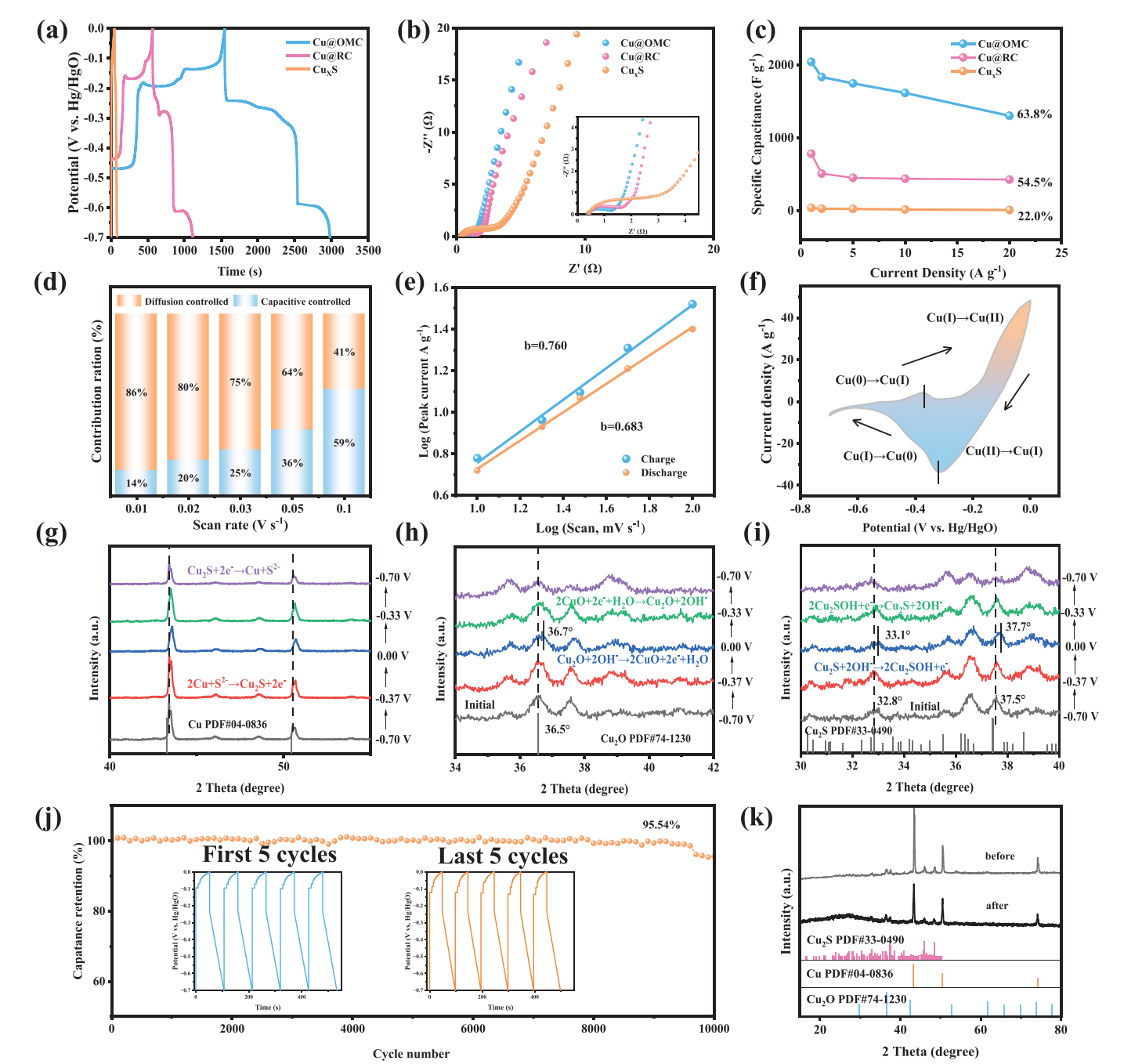 图6a展示了CV曲线,Cu@OMC表现出良好的法拉第反应可逆性,说明其电荷传输能力较强。图6b展示了Nyquist图,Cu@OMC的电荷转移阻抗(Rct)最低,表明其电导性最好。图6c展示了比电容保持率,Cu@OMC在高电流密度下仍能保持较高的比电容,显示出良好的快速充放电性能。图6d展示了电容与扩散贡献分析,表明Cu@OMC在低电流密度下以电容控制为主,高电流密度下扩散效应增加。图6e展示了比电容变化,显示Cu@OMC即使在高电流密度下仍保持较高的比电容,具有优秀的电荷存储能力。图6f展示了GCD曲线,Cu@OMC的充放电曲线对称,证明其电荷存储和释放效率高。图6g展示了电荷存储贡献,显示Cu@OMC的电荷存储主要由电容效应和扩散效应共同作用。图6h展示了线性关系,表明Cu@OMC表现出良好的电容控制。图6i展示了电流响应,Cu@OMC具有更高的电流响应速度,进一步提升其电荷转移能力。图6j展示了循环稳定性,Cu@OMC在10,000次循环后保持97.29%的容量,表现出卓越的稳定性。图6k展示了XRD图谱,Cu@OMC在长时间循环后保持结构稳定,无明显变化。
