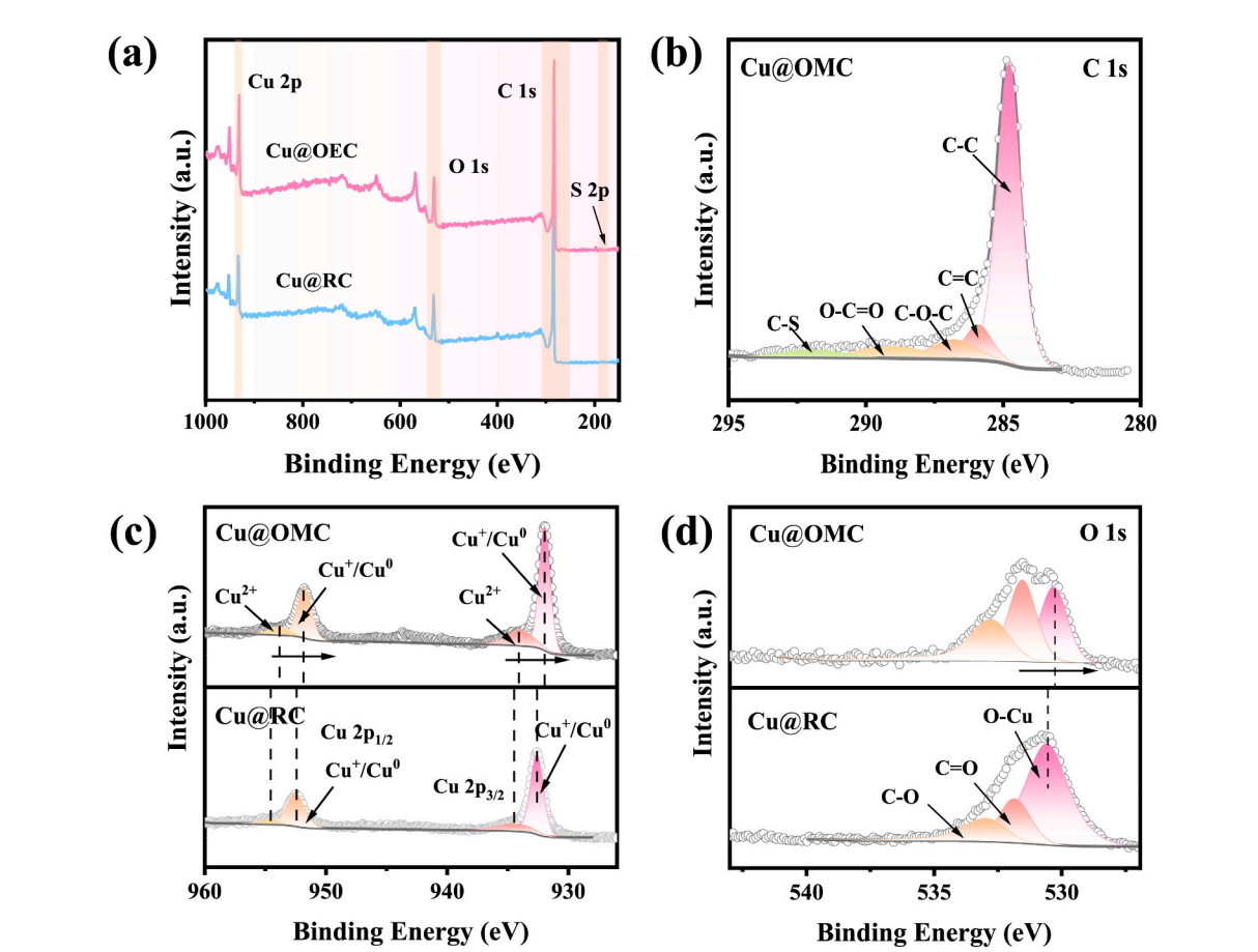 图5展示了通过XPS表征得到的化学成分和氧化态分析结果。图5a展示了Cu@OMC和Cu@RC的XPS全扫描谱,证明了材料表面含有C、Cu、S和O元素。图5b展示了Cu@OMC中C 1s的XPS谱图,其中出现的不同结合能峰分别归属于C–S、O–C–O和C–C等官能团。图5c展示了Cu 2p谱图,揭示了Cu@OMC中Cu0和Cu+的氧化态,表明其具有较为丰富的氧化还原对。图5d展示了O 1s谱图,表明Cu@OMC中的Cu–O键和C–O键的存在,进一步验证了氧基团在材料中的作用。