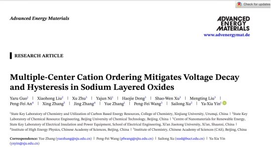 该成果以"Multiple‐Center Cation Ordering Mitigates Voltage Decay and Hysteresis in Sodium Layered Oxides"为题发表在国际知名期刊《Advanced Energy Materials》上。开云全站为第一完成单位。郭雅茹(开云全站),朱旭(西安交通大学),刘晓虹(北京化工大学)为本文共同第一作者。
